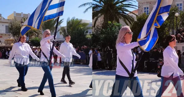 Μαθητές και μαθήτριες για ακόμη μια χρονιά παρήλασαν ωστόσο στην παρέλαση της Σύρου μας τράβηξε την προσοχή μια μητέρα που έγινε σημαιοφόρος.