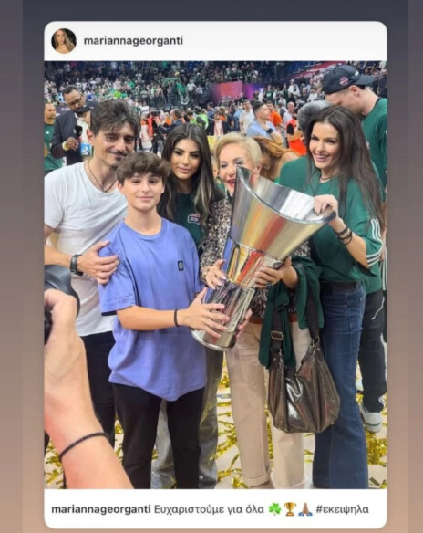 Ο επικεφαλής της ΚΑΕ Παναθηναϊκoύ ποζάρει δίπλα στη μητέρα του, Δέσποινα, τη σύζυγό του, Ιωάννα Μαροσούλη, και τα παιδιά τους, Δέσποινα και Παύλο, κρατώντας το τρόπαιο της Ευρωλίγκα, μέσα στην Uber Arena.