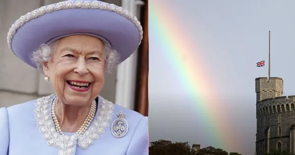 Ένα διπλό ουράνιο τόξο φαίνεται πως διαπέρασε τα σύννεφα πάνω από τα ανάκτορα του Μπάκιγχαμ στο Λονδίνο την Πέμπτη, 8 Σεπτεμβρίου 2022, λίγο πριν ανακοινωθεί η είδηση του θανάτου της Βασίλισσας Ελισάβετ, η οποία έφυγε από την ζωή σε ηλικία 96 ετών, έπειτα από 70 χρόνια παραμονής τον θρόνο.
