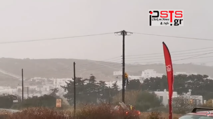 Συγκεκριμένα, το πρωί της Κυριακής και ενώ στην Πάρο έπεφτε ισχυρή βροχή, εναερίτες της ΔΕΗ ήταν σκαρφαλωμένοι σε ψηλό στύλο προκειμένου να επιδιορθώσουν βλάβη στο δίκτυο. Φορώντας τα αδιάβροχά τους ενώ η βροχή τους χτυπούσα, εκείνοι συνέχιζαν την προσπάθειά τους ώστε να ολοκληρώσουν το έργο τους, σύμφωνα με την ιστοσελίδα, parianostypos.gr.Ένα βίντεο που αποτυπώνει την προσπάθεια ενός εξ΄αυτών προκαλεί ιδιαίτερη εντύπωση και…. χτυποκάρδια αγωνίας.