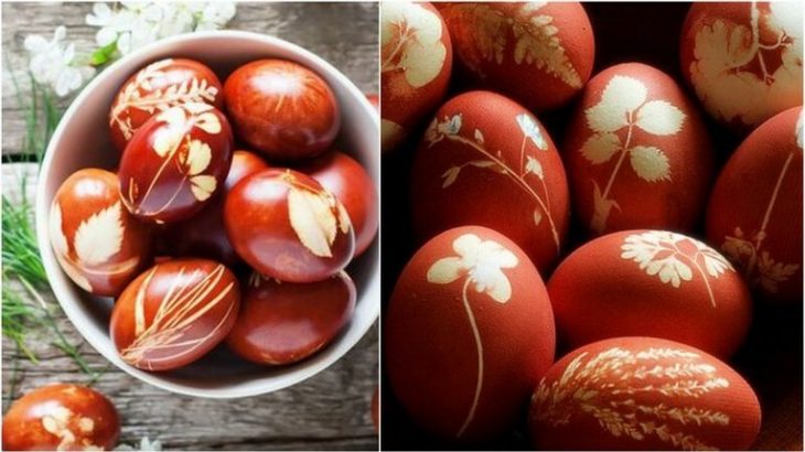 Kαι τα αυγά που θα βάψετε με αυτόν τον οικολογικό τρόπο αποκτούν πολύ όμορφη εμφάνιση αν χρησιμοποιήσετε φυλλαράκια φυτών για να αποτυπώσετε σχέδια στην επιφάνειά τους.