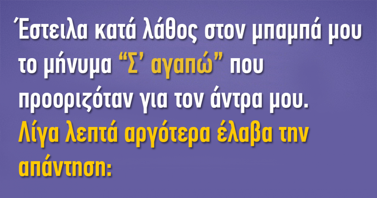 Σήμερα, επέλεξα λάθος αριθμό και έστειλα κατά λάθος στον μπαμπά μου ένα μήνυμα που έγραφε “Σ’ αγαπώ.” Το μήνυμα προοριζόταν για τον σύζυγό μου. Λίγα λεπτά αργότερα, έλαβα την απάντηση “Και εγώ σ’ αγαπώ.” Ήταν τόσο συγκινητικό. Λέμε τόσο σπάνια τέτοια πράγματα ο ένας στον άλλον.