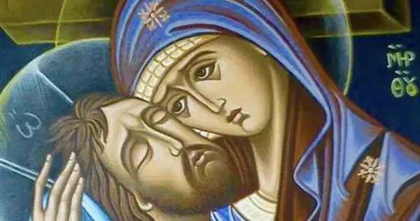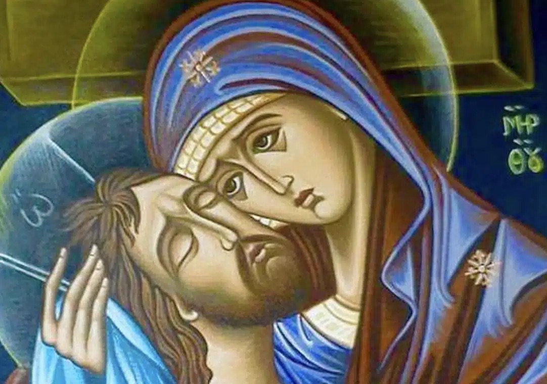 Σήκω και φύγε και πήγαινε στις πέτρες και στα βράχια Εκεί χτύπα τις γροθιές σου και μάτωσε τες. Εγώ πιστεύω και λατρεύω αυτό το όμορφο πρόσωπο της Παναγιάς μας Κανείς δεν πόνεσε περισσότερο από εκείνη και καμμιά καρδιά δε μάτωσε περισσότερο από την δική της.