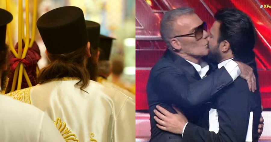 Την έντονη αντίδραση ενός ιερέα από τη Λαρίσα προκάλεσε το φιλί στο στόμa που έδωσε ο Στέλιος Ρόκκος στον παρουσιαστή Ανδρέα Γεωργίου κατά τη διάρκεια του live show στο Χ Factor, το βράδυ της Κυριακής.