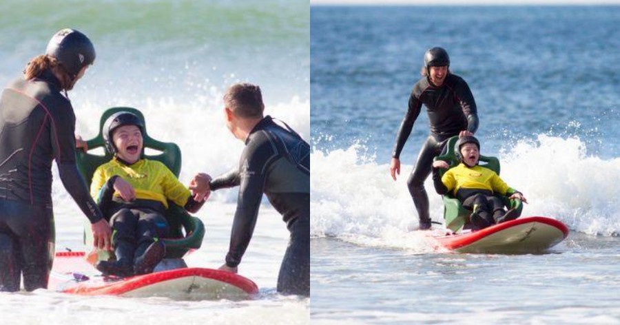 Η πλήρης χαρά αγοριού με αναπηρία καθώς το όνειρό του για σέρφινγκ γίνεται πραγματικότητα χάρη σε ειδικά διαμορφωμένη σανίδα.