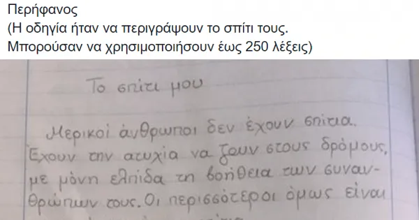 Το θέμα της έκθεσης ήταν “το σπίτι μου” (Η οδηγία ήταν να περιγράψουν το σπίτι τους. Μπορούσαν να χρησιμοποιήσουν έως 250 λέξεις)».