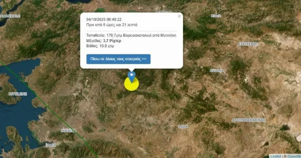 Σεισμική δόνηση 3,7 βαθμών της κλίμακας Ρίχτερ συνέβη στις 04/10/2025 06:49:22, 170,7χλμ Βορειοανατολικά από Μυτιλήνη και σε εστιακό βάθος 10,0 χιλιομέτρων.