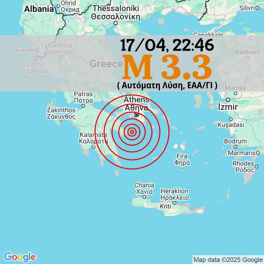 Σεισμός 3,3 βαθμών της κλίμακας Ρίχτερ σημειώθηκε το βράδυ της Μεγάλης Πέμπτης στον Σαρωνικό Κόλπο. Η σεισμική δόνηση έγινε αισθητή σε πολλές περιοχές της Αττικής.