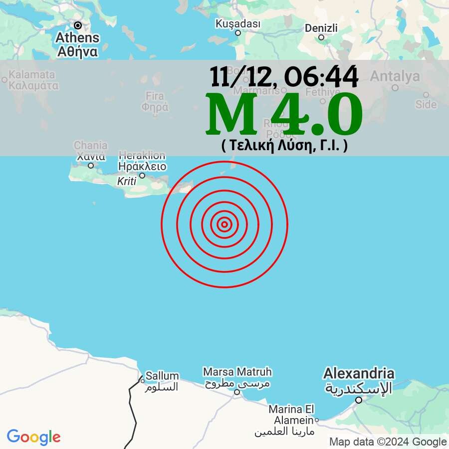 Σεισμός μεγέθους 4 βαθμών της κλίμακας Ρίχτερ, σημειώθηκε νωρίς το πρωί της Τετάρτης (11/12) στον θαλάσσιο χώρο νότια της Κρήτης.
