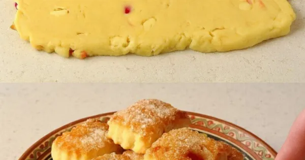 6️⃣ Σε ελαφρώς αλευρωμένη επιφάνεια ανοίγουμε τη ζύμη σε μέτριο πάχος. Αν θέλουμε πιο καραμελωμένο αποτέλεσμα, πασπαλίζουμε λίγη ζάχαρη από πάνω. Κόβουμε σε κομμάτια και τα τοποθετούμε σε ταψί με λαδόκολλα.