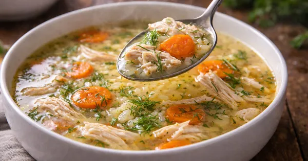 Λίγο πριν το σερβίρισμα, βυθίστε ένα δεματάκι άνηθο δεμένο με σπάγκο για να δώσετε επιπλέον άρωμα. Δοκιμάστε τον ζωμό και διορθώστε το αλάτι ή το πιπέρι αν χρειάζεται. Προσθέστε το κομμένο καρότο και το ψιλοκομμένο κοτόπουλο, ανακατέψτε και σερβίρετε ζεστή.