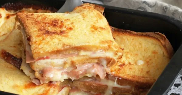 Σε ένα ταψί βάζουμε μια στρώση από τις φέτες ψωμιού, στη συνέχεια καλύπτουμε με τυρί και ζαμπόν και από πάνω προσθέτουμε ξανά τις φέτες και συνεχίζουμε μέχρι να τελειώσουν όλα τα υλικά.