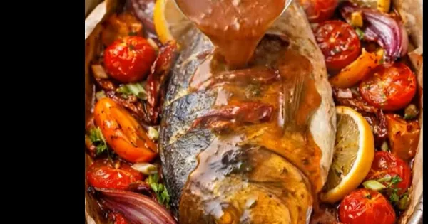 Χαράζουμε ελαφρά την τσιπούρα σε δύο σημεία, χωρίς βαθιές τομές, τη αλατίζουμε ελαφρώς και την τοποθετούμε πάνω από τα λαχανικά.