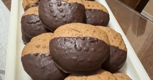 Βουτάμε τα μπισκότα στη σοκολάτα και τα τοποθετούμε σε ταψί με αντικολλητικό χαρτί.