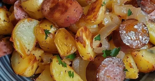 Ένα πιάτο απλό αλλά απίστευτα χορταστικό, που φτιάχνεται εύκολα και λερώνει μόνο ένα τηγάνι. Ο συνδυασμός καπνιστού λουκάνικου, πατάτας, κρεμμυδιού και πολύχρωμων πιπεριών δημιουργεί ένα γεύμα πλούσιο σε γεύση και άρωμα. Είναι ιδανικό για γρήγορο βραδινό, για οικογενειακό τραπέζι ή ακόμα και για ένα εύκολο κυριακάτικο φαγητό χωρίς κόπο.