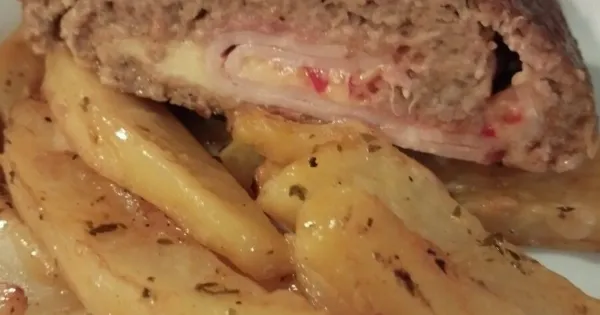 Ένα κλασικό φαγητό φούρνου που γίνεται ζουμερό και γεμάτο γεύση. Το ρολό κιμά με γέμιση λιώνει στο εσωτερικό και συνοδεύεται τέλεια με πατάτες.