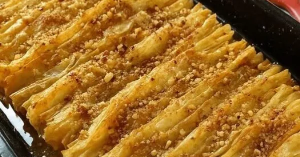 Δεν είναι μπακλαβάς και δεν είναι κανταΐφι. Είναι το δικό του ξεχωριστό νησιώτικο γλυκό, που ψήνεται σε ταψί με πλισέ φύλλο και κόβεται σε μικρές, τραγανές μπουκιές.