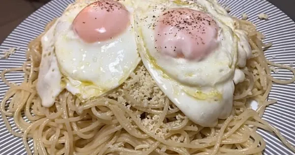 Σερβίρουμε τα μακαρόνια και βάζουμε από πάνω το αυγό.