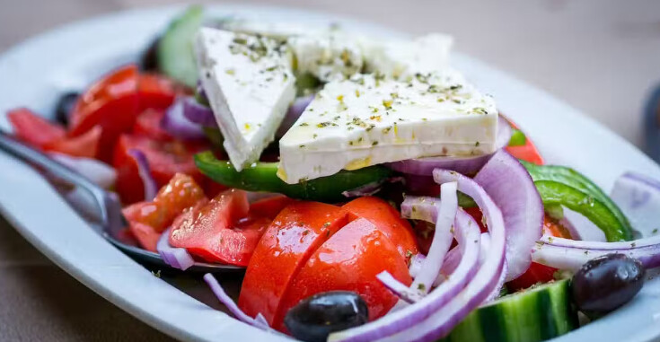 «Η ελληνική σαλάτα, γνωστή και ως χωριάτικη, είναι το εθνικό πιάτο της Ελλάδας, που αποτελείται από ντομάτες, κρεμμύδια σε φέτες και χοντρές φέτες αγγουριού. Ανάλογα με την περιοχή, μπορεί να υπάρχουν επίσης ελιές, πράσινες πιπεριές, τυρί φέτα, ρίγανη, αλάτι, πιπέρι ή ένα ντρέσινγκ από ελαιόλαδο και λεμόνι ή ξύδι (προαιρετικά).