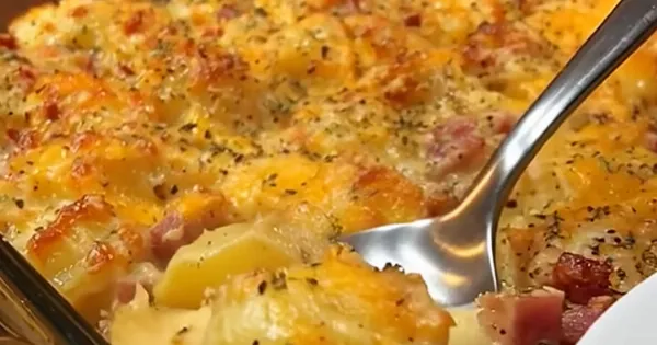 Αυτό το πιάτο συνδυάζει ζαμπόν κομμένο σε κύβους, πατάτες και κρεμμύδι με μια κρεμώδη βάση από σούπα τσένταρ και ξινή κρέμα, δημιουργώντας ένα πλούσιο και απολαυστικό αποτέλεσμα. Όλα ψήνονται μαζί σε ένα ταψί, ώστε οι γεύσεις να δέσουν τέλεια. Μετά το ψήσιμο, το φαγητό βγαίνει χρυσαφένιο και αφράτο, με μια λαχταριστή, λιωμένη στρώση τυριού από πάνω.