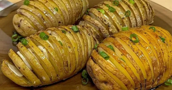 - Πλένεις καλά τις πατάτες και τις κόβεις σε φέτες χωρίς να τις χωρίσεις τελείως.