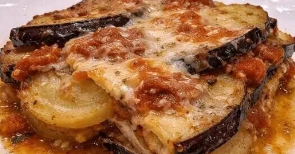 1️⃣ Καθαρίζουμε και κόβουμε τις πατάτες και τις μελιτζάνες σε φέτες.