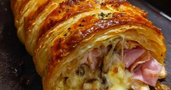 Ρολάδα σφολιάτας με ζαμπόν, τυρί και μανιτάρια: εύκολη και πεντανόστιμη