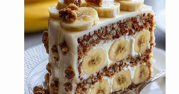 Πασπάλισε με τα ψιλοκομμένα καρύδια (αν είναι καβουρδισμένα, ακόμα καλύτερα). Γάρνιρε με φέτες μπανάνας και μισά καρύδια. Βάλε το κέικ στο ψυγείο για τουλάχιστον 30 λεπτά πριν το κόψεις — έτσι «δένει» καλύτερα και κόβεται πιο όμορφα