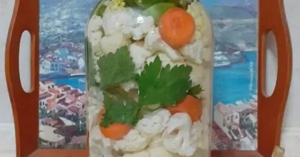 Γεμίζουμε το βάζο με τα λαχανικά, εναλλάσσοντας κουνουπίδι, καρότο, σκόρδο, σέλινο και πιπεριές.