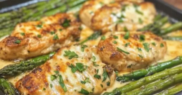 Ένα εύκολο, ζουμερό και κρεμώδες φαγητό φούρνου που συνδυάζει κοτόπουλο, σπαράγγια και τυρί — ιδανικό για οικογενειακό τραπέζι!