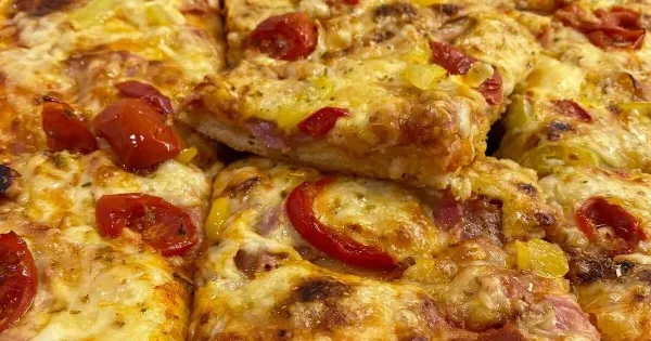 Μία σπέσιαλ πίτσα που θα κάνει την πιτσαρία της γειτονιάς σας να κλείσει έτσι και μοιραστείτε την συγκεκριμένη συνταγή και με άλλους φίλους σας θα μοιραστούμε σήμερα εμείς μαζί σας. Μία Τετράγωνη πίτσα με λαχταριστά τυριά που λιώνουν, ζαμπόν, μπέικον, ντοματίνια και χρωματιστές πιπεριές.