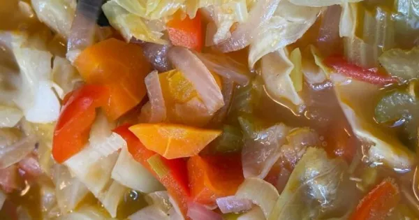 2 κουταλιάς ελαιόλαδο, 1 λευκό ή κίτρινο μεγάλο κρεμμύδι, 1 κούπα celery κομμένο, 1 κούπα καρότα κομμένα, 1 κούπα πράσινη ή κόκκινη πιπεριά ψιλοκομμένη, 3 σκελίδες σκόρδο, τα σοτάρετε καλά και μετά από λίγα λεπτά ρίχνετε 4 κούπες βρασμένο νερό με έναν κύβο κοτόπουλο, ( έβαλα λαχανικών ), 1 Ντομάτα μεγάλη ή μια κονσέρβα ντομάτα, έριξα αρκετό φρέσκο βασιλικό, ρίγανη αλάτι και πιπέρι και λίγο μπούκοβο και μετά μισό λάχανο κομμένο σε κομματάκια. Σιγοβράζετε για κανένα 15 λέπτο και είναι τόσο νόστιμη σερβίρετε μαζί με λίγο πιπέρι καγιέν ( βοηθάει στο να χάσεις καλύτερα).
