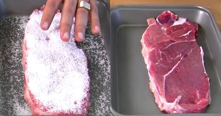 Το μυστικό κρύβεται στο αλάτι: απλώστε μια γερή δόση αλατιού σε όλο το κρέας και αφήστε το. Στο τέλος ξεπλύνετε πολύ καλά, ώστε να μη μείνει καθόλου αλάτι.