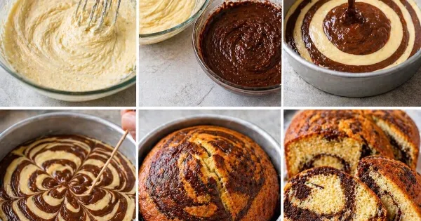Ρίχνουμε εναλλάξ τα δύο μείγματα σε φόρμα και με ένα μαχαίρι κάνουμε ελαφρά σχέδια για το εφέ μαρμπρέ.