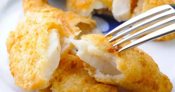 Κι εδώ έρχεται το μέγα μυστικό, μια χούφτα παγάκια μέσα στο μείγμα από το κουρκούτι. Ρίχνουμε τα φιλέτα, αφαιρούμε το πολύ κουρκούτι και τηγανίζουμε σε ηλιέλαιο. Δύο λίτρα αρκούν με τη φωτιά στο 7! Μετά από 15 λεπτά βάζουμε τα χρυσά φιλέτα σε απορροφητικό χαρτί.