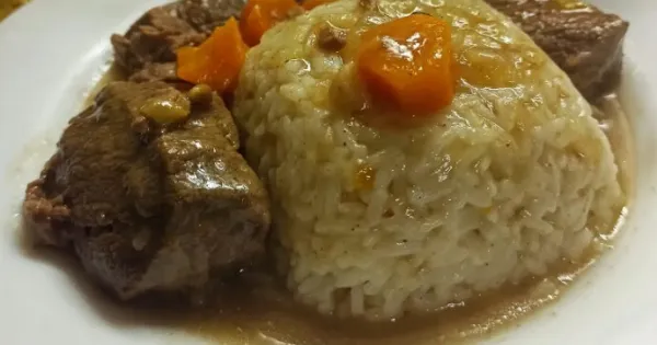 Σερβίρουμε το μοσχάρι με το πιλάφι και περιχύνουμε με τη λεμονάτη σάλτσα.