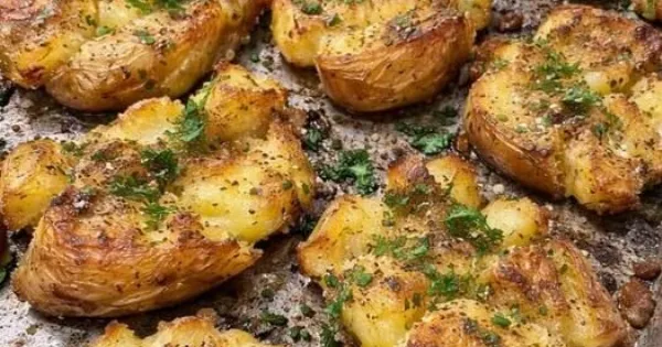 4️⃣ Τις βάζουμε σε ταψί και προσθέτουμε λάδι, σκόρδο και μπαχαρικά.