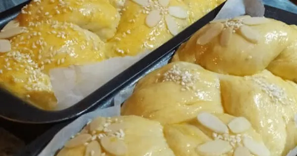 3️⃣ Πλέκουμε κοτσίδα και τοποθετούμε σε ταψί με λαδόκολλα.