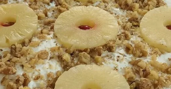 Ο συνδυασμός του στραγγιστού γιαουρτιού με τον γλυκό ανανά δημιουργεί μια υπέροχη ισορροπία γεύσης, ενώ η σαντιγί χαρίζει αφράτη υφή στο γλυκό. Τα καρύδια από πάνω προσθέτουν τραγανότητα και κάνουν το αποτέλεσμα ακόμη πιο απολαυστικό.