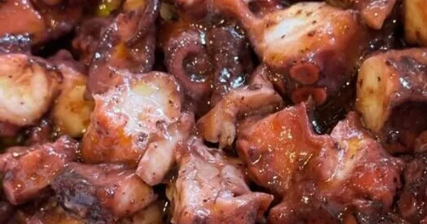 7️⃣ Κόβουμε το χταπόδι σε κομμάτια και το βάζουμε σε μπολ μαζί με το ζουμάκι του.