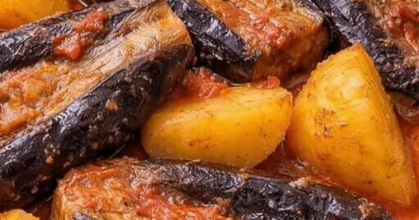 Σε ταψί βάζουμε τις μελιτζάνες και τις πατάτες.