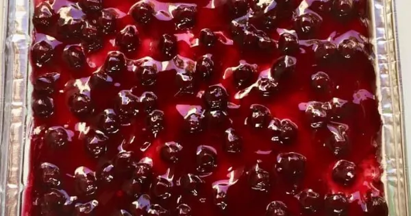 Όταν το μείγμα έχει σφίξει καλά, βγάζουμε το ταψί και απλώνουμε τη μαρμελάδα φραγκοστάφυλο από πάνω, χρησιμοποιώντας ένα κουτάλι για να την απλώσουμε ομοιόμορφα.