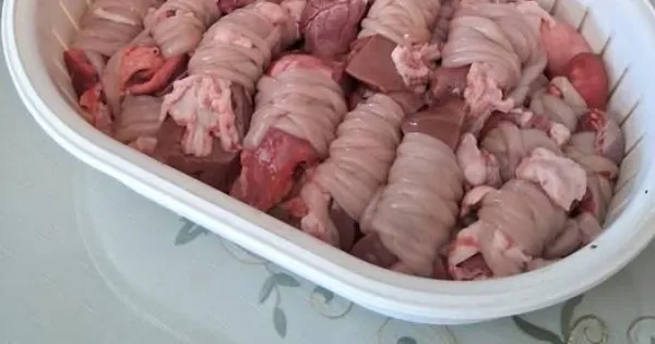 5️⃣ Τυλίγεις κάθε κομμάτι με έντερο.