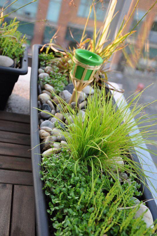 Οι ζαρντινιέρες, εκτός από τα κλασικά φυτά, μπορούν να χρησιμοποιηθούν για ξεχωριστές συνθέσεις με πέτρες, βότσαλα, πράσινα φυτά, δάδες ή ηλιακά φαναράκια.