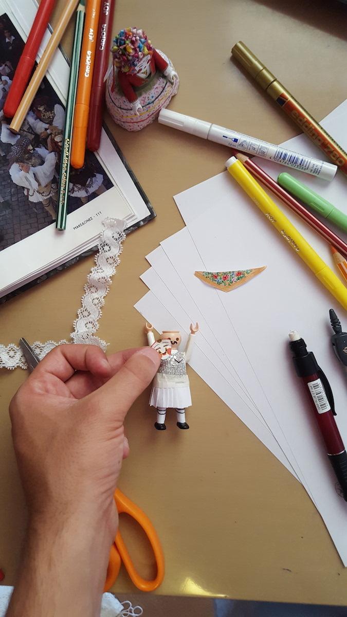 Αυτοσχέδια εργαλεία, μαρκαδόροι και κάθε είδους χαρτιά και υλικά για να ντυθούν τα playmobil παραδοσιακά.