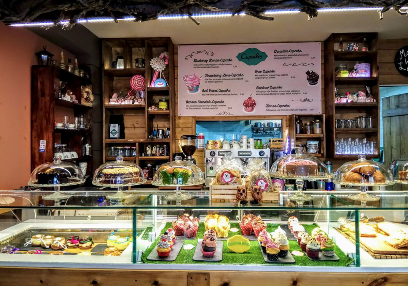 Όλοι οι υπάλληλοι είναι ντυμένοι αναλόγως. Τίποτα δεν μαρτυρά ότι βρίσκεσαι στη γη! Και οι λιχουδιές; Όλες φρεσκότατες, λαχταριστές, μυρωδάτες και με γλυκό πάντα ημέρας στο μενού. Αρχίζουμε: ροφήματα πραγματικής σοκολάτας με μαύρη σοκολάτα ή σοκολάτα γάλακτος σε διάφορες γεύσεις με μπαχαρικά, μπισκότο κ.ο.κ., γλυκά, τούρτες-κέικ με ό,τι γέμιση και επικάλυψη βάλει ο νους σου, από καρότο και λεμόνι, μέχρι πραλίνα, μπανάνα, μαρμελάδα, φιστικοβούτυρο, κρέπες για όλα τα γούστα, cupcakes και φυσικά τσάι με διάφορες γεύσεις σε εμαγιέ φλιτζανάκια, αρωματικοί καφέδες, φρέσκοι χυμοί και μπίρα και κρασί χωρίς αλκοόλ. Και όλα σε τιμές προσιτές (από 2-7 ευρώ περίπου).