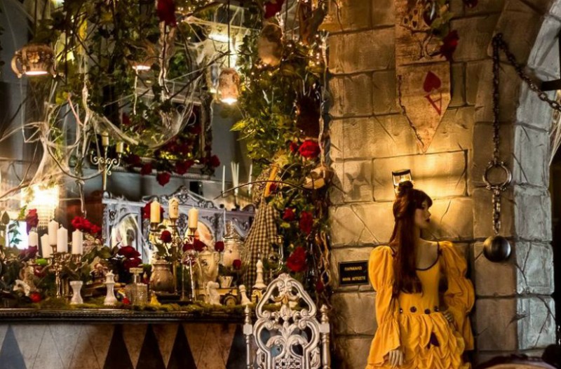 Συντριβάνια, δέντρο με βελανίδια και μανιτάρια, διάφορα πουλιά (νυχτερίδες, κουκουβάγιες), σαύρες, αράχνες, στολίδια, όλα μέρος μιας vintage ατμόσφαιρας και οι σερβιτόροι πάντα ντυμένοι με στολές εμπνευσμένες από τον κόσμο των παραμυθιών.