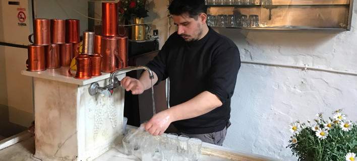 Ξεχωρίζει ο μαρμάρινος νεροχύτης το βάθος του μαγαζιού και στο στο τραπέζι σου θα βρείς κομμάτια χαρτιού αντί για χαρτοπετσέτες. Στις κολώνες κάδρα με αποκόμματα από παλιές εφημερίδες και ποιήματα του Κώστα Βάρναλη γιατί σε αυτό το μαγαζί σύχναζε και εκεί, λέγεται, εμπνεύστηκε μερικά από τα ποιήματα του.