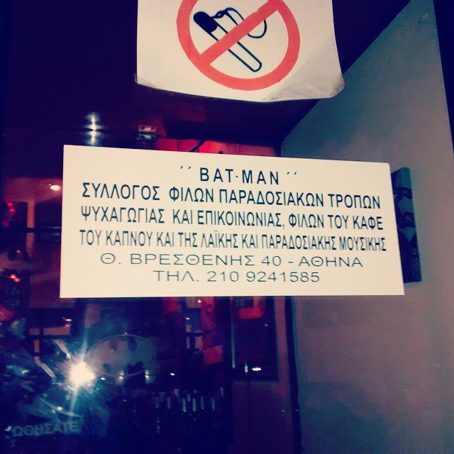 Για τους πενηντάρηδες που το λέει η καρδιά τους, το άφτερ δεν είναι επιλογή, είναι υποχρέωση. Και ο Batman δεν είναι ένα απλό μπαρ, είναι ιδέα. Το μαγαζί που έχει στήσει από το 1989 ο Γιώργος Νάσιος δεν κοιμάται ποτέ και χωρά όλα κι όλα πενήντα-εξήντα άτομα, χαρίζοντας αυθεντικές στιγμές διασκέδασης με ρεμπέτικα, αλλά και αλλαγές που θα σας ξενίσουν αν δεν το έχετε επισκεφτεί στο παρελθόν. Αλλά επειδή αυτό είναι μάλλον αδύνατο, τότε γνωρίζετε κι εσείς καλά πως μετά από Καζαντζίδη, εδώ μπορείτε εύκολα να ακούσετε Pink Floyd ή Doors. Η ρεμπετο-ροκο- καψούρα εδώ είναι δωρεάν και άφθονη, τα ποτά απλώς στοιχίζουν 7€.