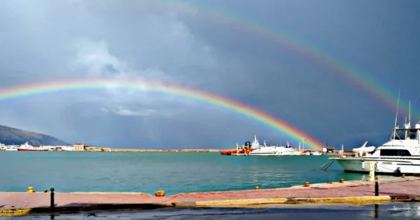 Ήδη το μεσημέρι του Σαββάτου ένα διπλό ουράνιο τόξο έκανε την εμφάνισή του πάνω από την πόλη της Χίου. Σύμφωνα με την Ε.Μ.Υ. ο καιρός θα αρχίσει να βελτιώνεται από το πρωί της Κυριακής και θα είναι σαφώς βελτιωμένος από τη Δευτέρα, με εξασθένιση των ανέμων.